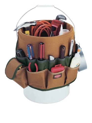Features 35 multi-sized pockets, 27 on the outside and 8 inside, including pockets to hold spray cans or larger hand tools. Tape measure pocket offers quick access and convenient storage. Flapped pocket keeps items secure. Constructed of rugged water-resistant 600 denier fabric. Bucket not included.